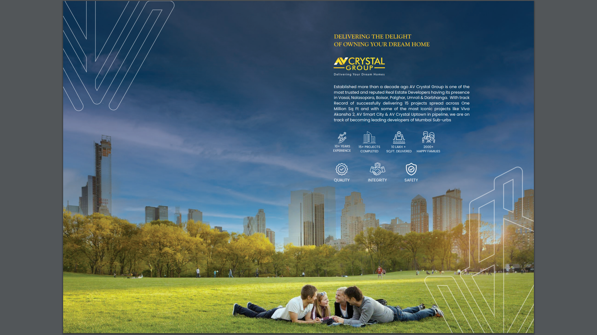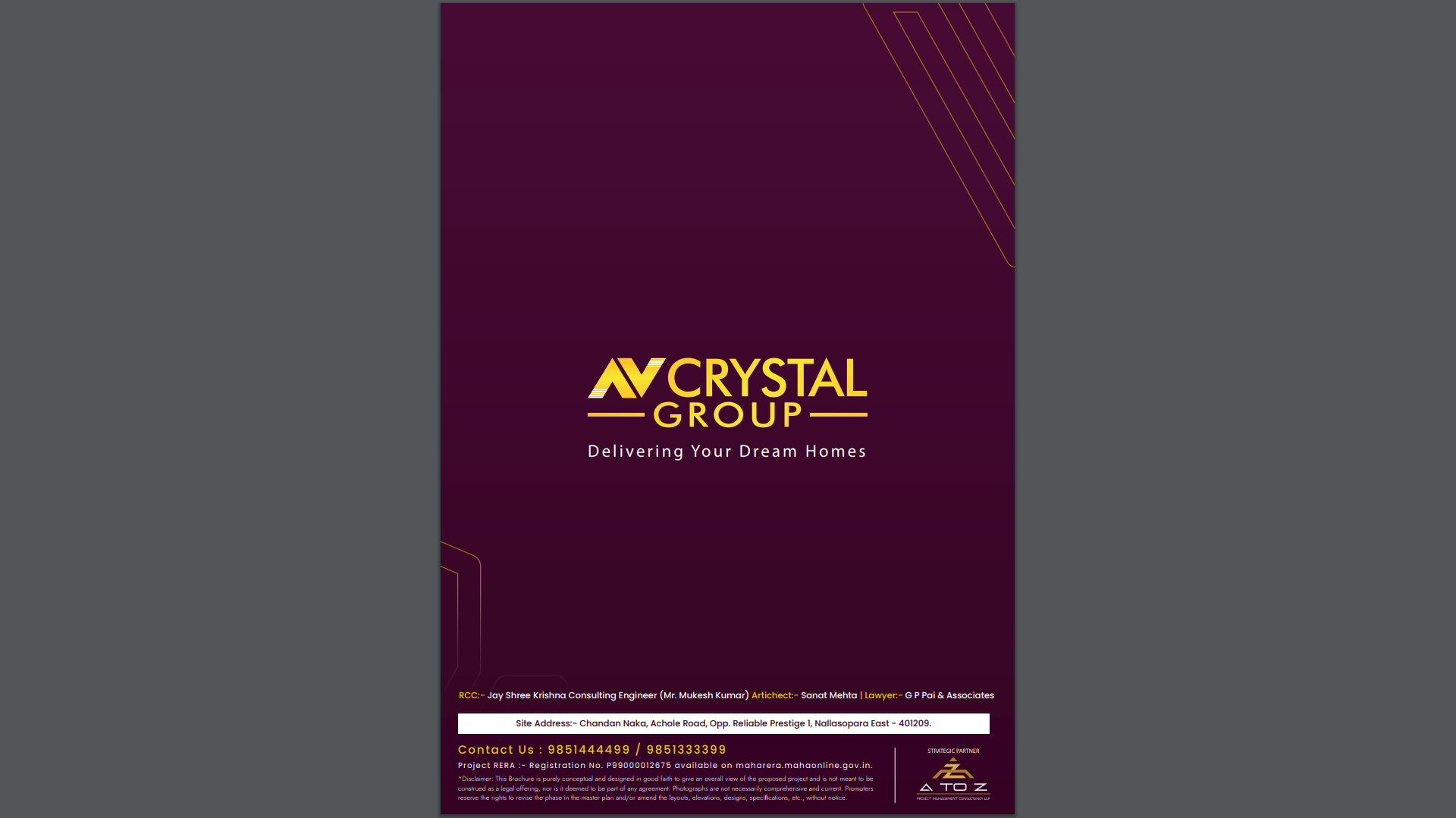 AV Crystal is a project by AV Group in Mumbai. It is a Under Construction project. AV Crystal offers some of the most conveniently designed Apartment. Located in Nalasopara East, it is a residential project. The project is spread over 1 Acres . It has 134 units. There is 1 building in this project. AV Crystal offers some of the most exclusive 1 BHK, 2 BHK. As per the area plan, units are in the size range of 348.0 - 509.0 sq.ft.. Launched in April 2018, AV Crystal is slated for possession in Apr, 2024. The address of AV Crystal is Survey No. 123, Hissa No. 6B, At Vasai Virar City, Nala Sopara.
